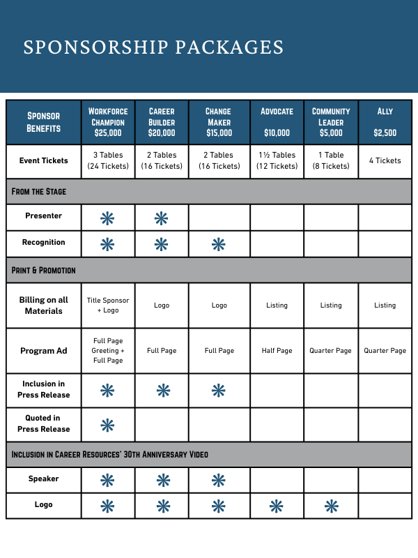 As an inaugural sponsor, your participation will help to springboard Career Resources into its next decade. Sponsorship support directly fuels hands-on training, job placement, and employer partnerships that create lasting economic mobility—not just for individuals, but for families and neighborhoods. Sponsorship levels are detailed below. Thank you for your support.